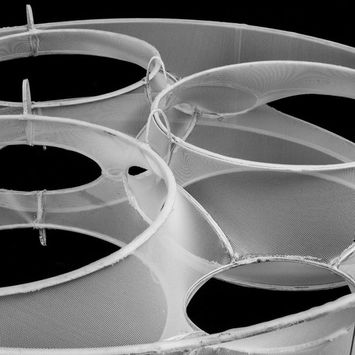 Students in this seminar explored inflatable bladders as flexible formwork for casting cementitious structures. The formwork was suspended from pouring points at certain corners to allow the mesh to deform into catenary shells under gravity. Heat sealing patterns were developed to channel the mix into the bladders and direct structural forces through the grid shell. Students also tested woven aircraft cable and networked zip-ties as strategies for integral reinforcement.